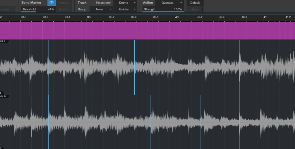 Podemos ver na figura acima que possuímos muito transientes detectados, então devemos diminuir o Threshold (limiar) para que ele não detecte tantos picos. Ou seja, estamos diminuindo a capacidade do Studio One de separar o que é transiente do resto do envelope. Vejamos alguns valores.