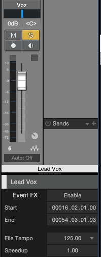 Quando se seleciona uma pista e a letra “i” (Inspector) está ativada é possível ver uma gama de opções, focaremos nas duas primeiras. Para essa aplicação manteremos a variável “tempo” em Timestretch, que significa que o áudio se expandirá e comprimirá automaticamente caso o BPM da música se alterado. Demais valores serão discutidos posteriormente (Pouco utilizados)