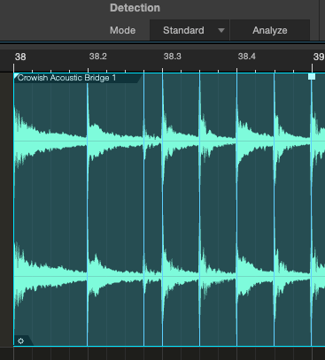 Selecionado o áudio e o modo de detecção, pode-se clicar em “Analyze” observe que aparentemente ocorreu a mesma coisa da tecla Q, porém dessa vez o áudio não foi quantizado, estamos em processo de análise da detecção dos transientes do