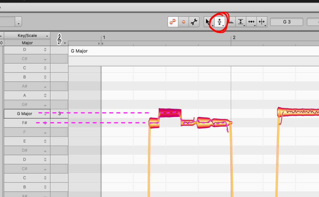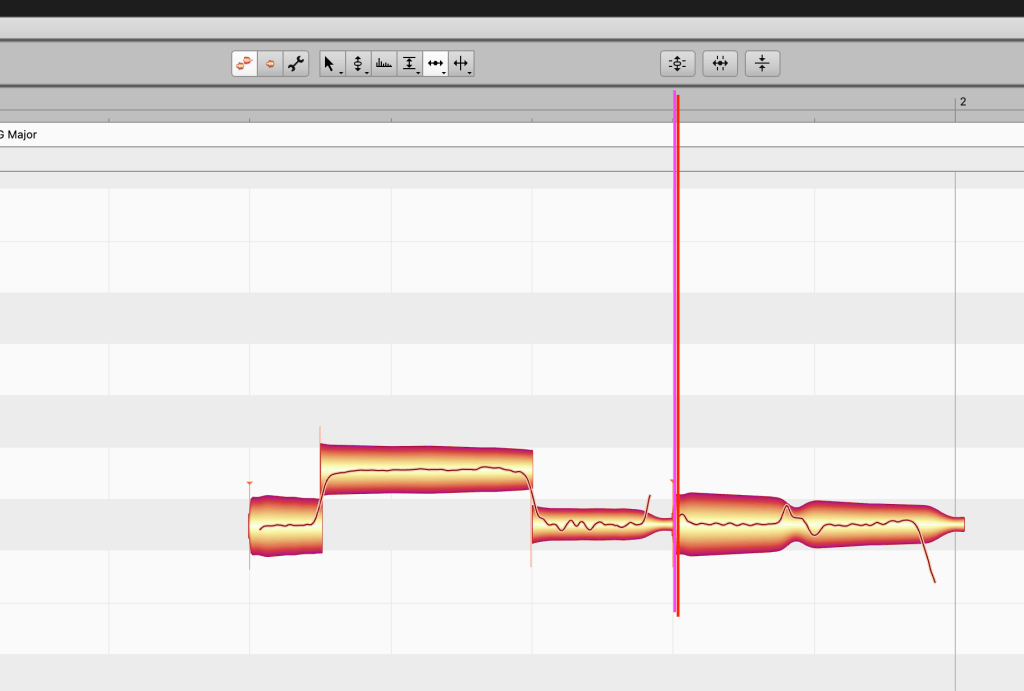 Como pode-se observar, o material de áudio usado como exemplo inicia na nota F#, atinge a nota G e depois retorna para F#. Posteriormente, retorna para G.