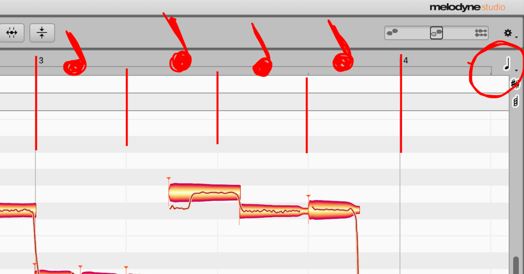 Na direita em cima da interface do Melodyne há uma figura musical que indica qual subdivisão deve ser utilizada como base para que as correções sejam majoritariamente feitas. Observe abaixo como elas se correlacionam.
