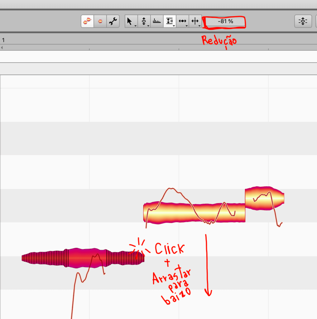 Com a ferramenta selecionada, clique no blob que foi identificada a sibilância, mantenha seu mouse pressionado e arraste-o para baixo. Você terá um feedback visual da redução da sibilância, bem como poderá observar a porcentagem da redução.
